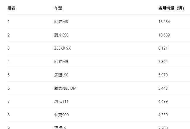 第六到第十分别是腾势N8L(5443辆)、风云T11(4499辆)、领克900(4330辆)、理想L9(2208辆)和猛士M817(1968辆),有风云T11这样的新手,也有理想L9这样的老将。虽然大家都占有一席之地,但仍有较大的提升空间。